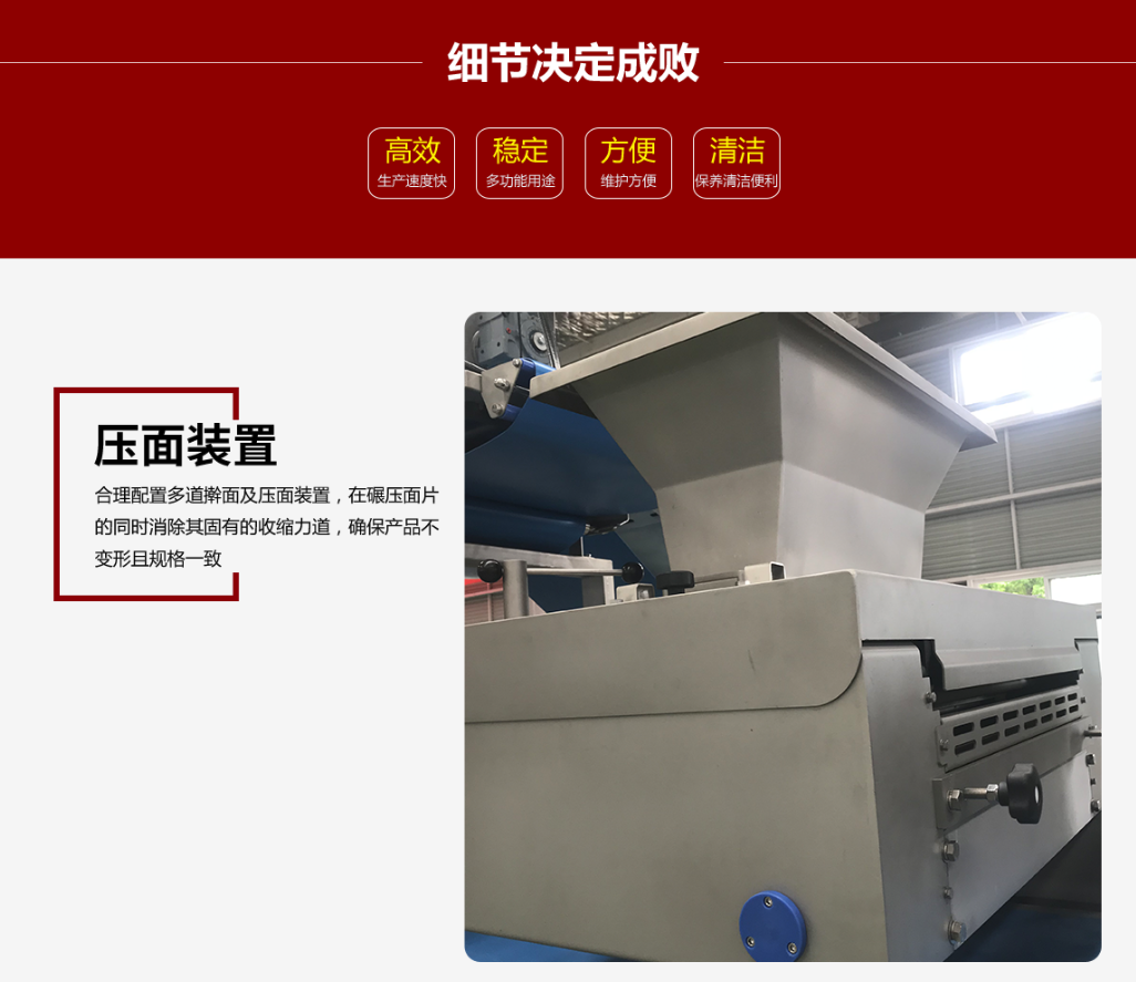 1,多輥搟面:搟面裝置高速碾壓面片,精確控制面片厚度。